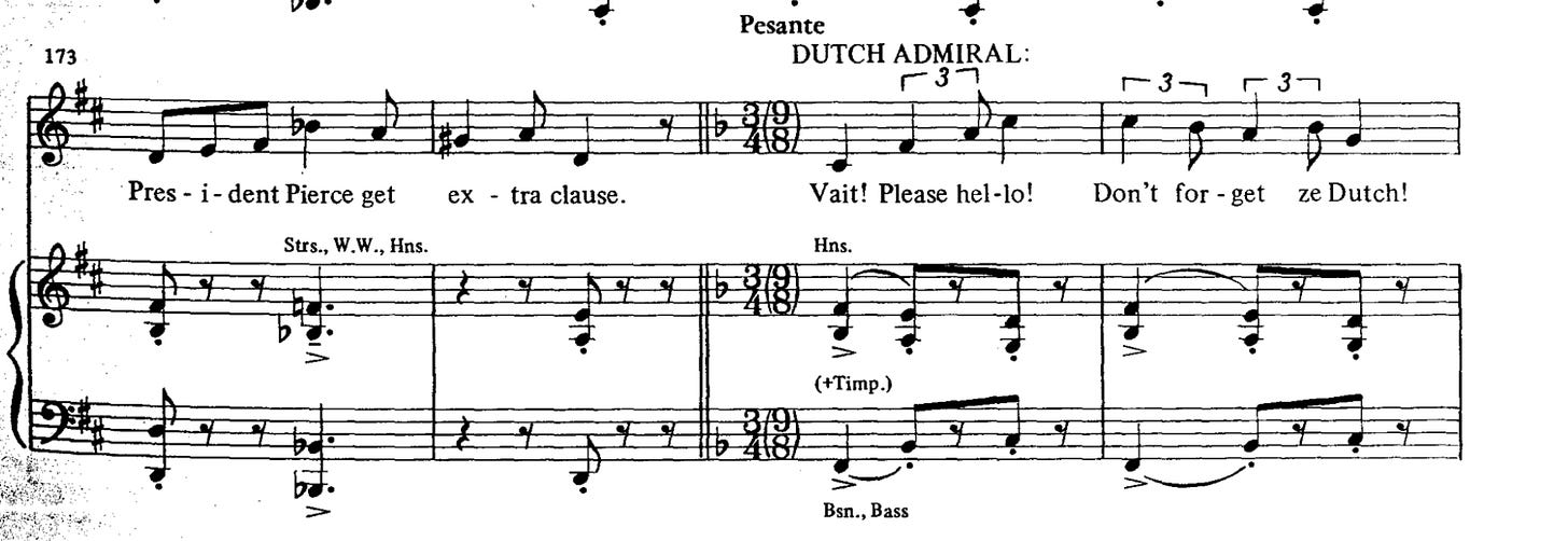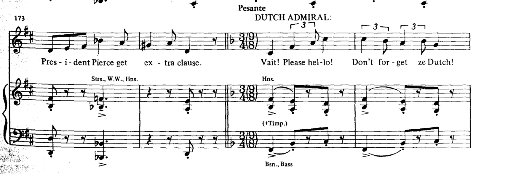 Sondheim writes a kind of clog dance. Everything in “Please Hello” prior to the Dutch arrival has been in duple time: the American Admiral was set principally in 6/8, the British Admiral principally in 2/4. We are now in triple time — in this case, a 3/4 that feels like 9/8. And it’s easy to hear the shift in character: less commanding, more needling, more dancelike. The Dutch Admiral, rather than breaking down the door or overwhelming us with bureaucracy, takes us by the hand and spins us into a transaction.