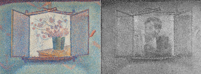 In 2014, a scanner developed by the Italian Institute of Optics revealed that the vase was once something else entirely: Seurat himself, at his easel, watching. The picture frame had been a mirror. It would have been Seurat’s only self-portrait. He painted over it.