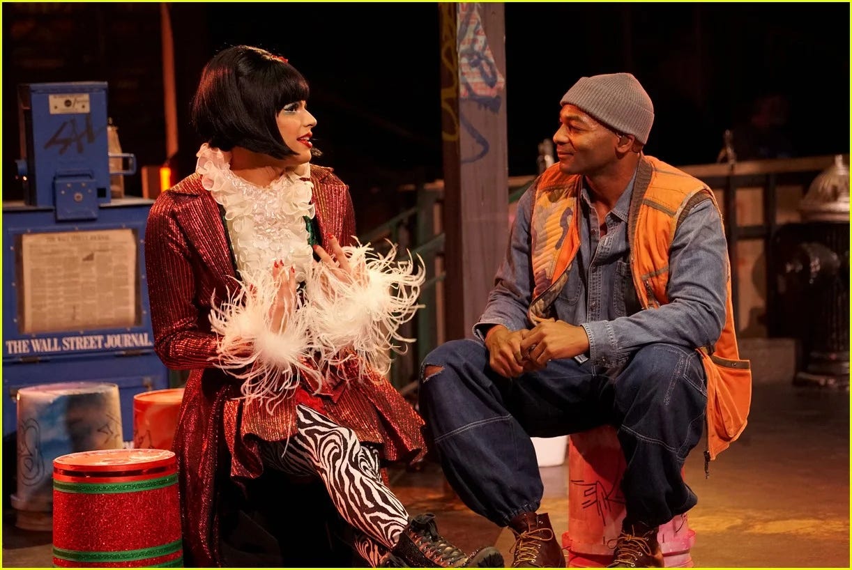 Jonathan Larson’s Rent takes that inward persistence and turns it outward, into the world, into action. When Angel dies, Collins reprises “I’ll Cover You,” a song that was playful in its first iteration, full of early-love negotiation and flirtation. “Live in my house, / I’ll be your shelter. […] Be my lover / And I’ll cover you.” As elegy, it becomes something else entirely: love as action performed after loss. The words are the same; context transforms them.